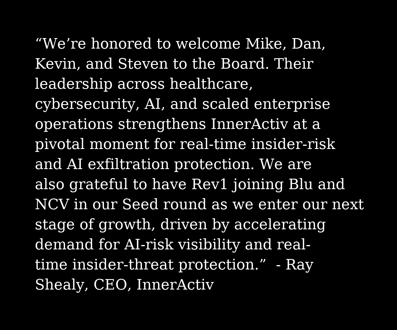 InnerActiv Inc., the leader in Insider Risk Intelligence & Protection for the AI Era, today announced major additions to its Board of Directors and Advisory Board. These updates follow Rev1 Ventures and the 71/70 Angel Fund joining Blu Ventures and North Coast Ventures (NCV) in InnerActiv’s Seed financing round, bringing strategic capital and regional support that will accelerate the company’s expansion across enterprise, healthcare, and government markets.